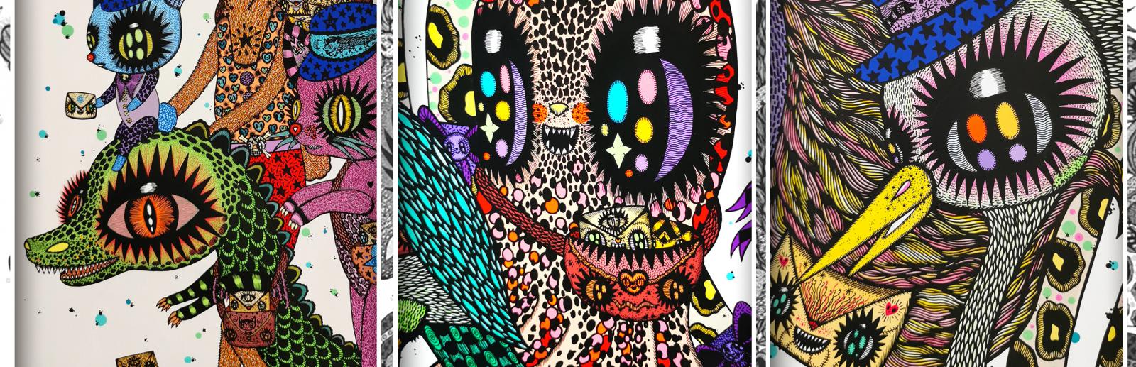 Le bestiaire fantastique qui s’étend comme un joyeux cortège sur l’œuvre de Ciou fascine, autant par sa composition colorée et foisonnante que par la richesse de ses détails.
