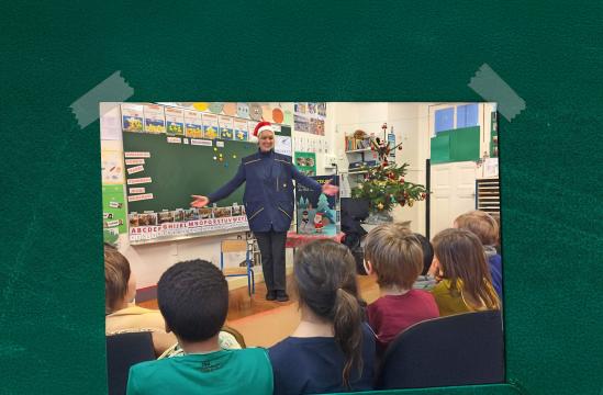 Atelier jeune public, animatrice habillée en facteur
